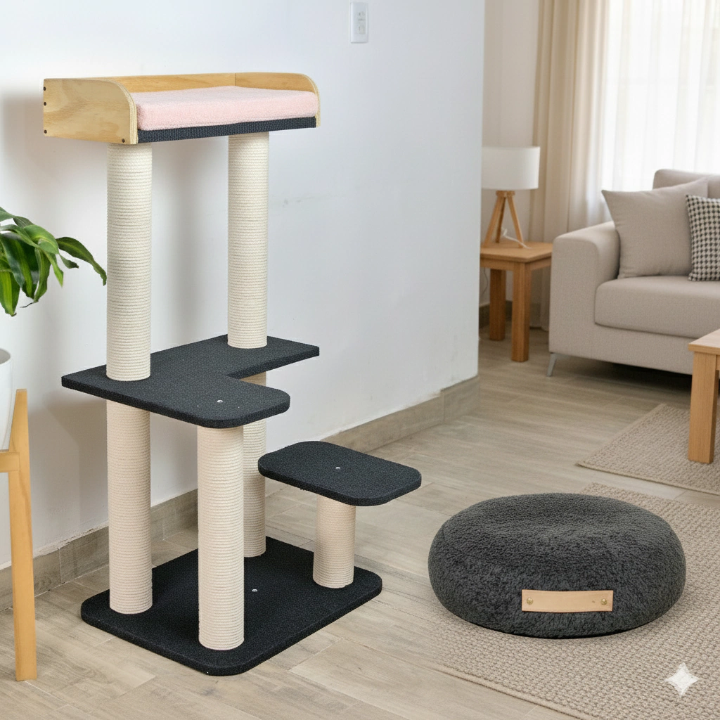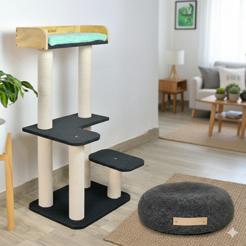 🌟 Variedad de Superficies: Todos los niveles están alfombrados para ofrecer suavidad y confort. Las columnas están cubiertas con un resistente cordón de algodón, ideal para el rascado.